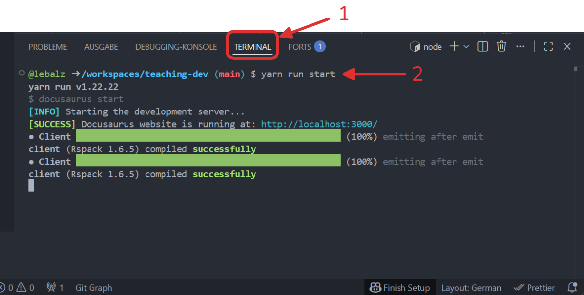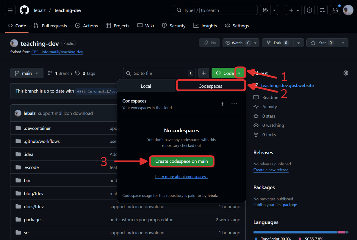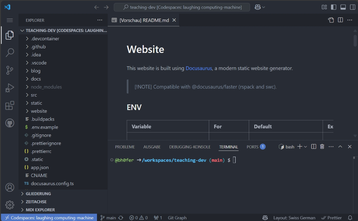 Um die Möglichkeiten von der Unterrichtswebseite auszuprobieren, ohne auf dem eigenen Computer etwas zu installieren, können 👉 GitHub Codespaces verwendet werden.